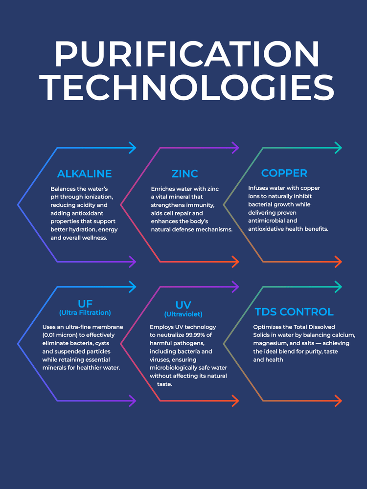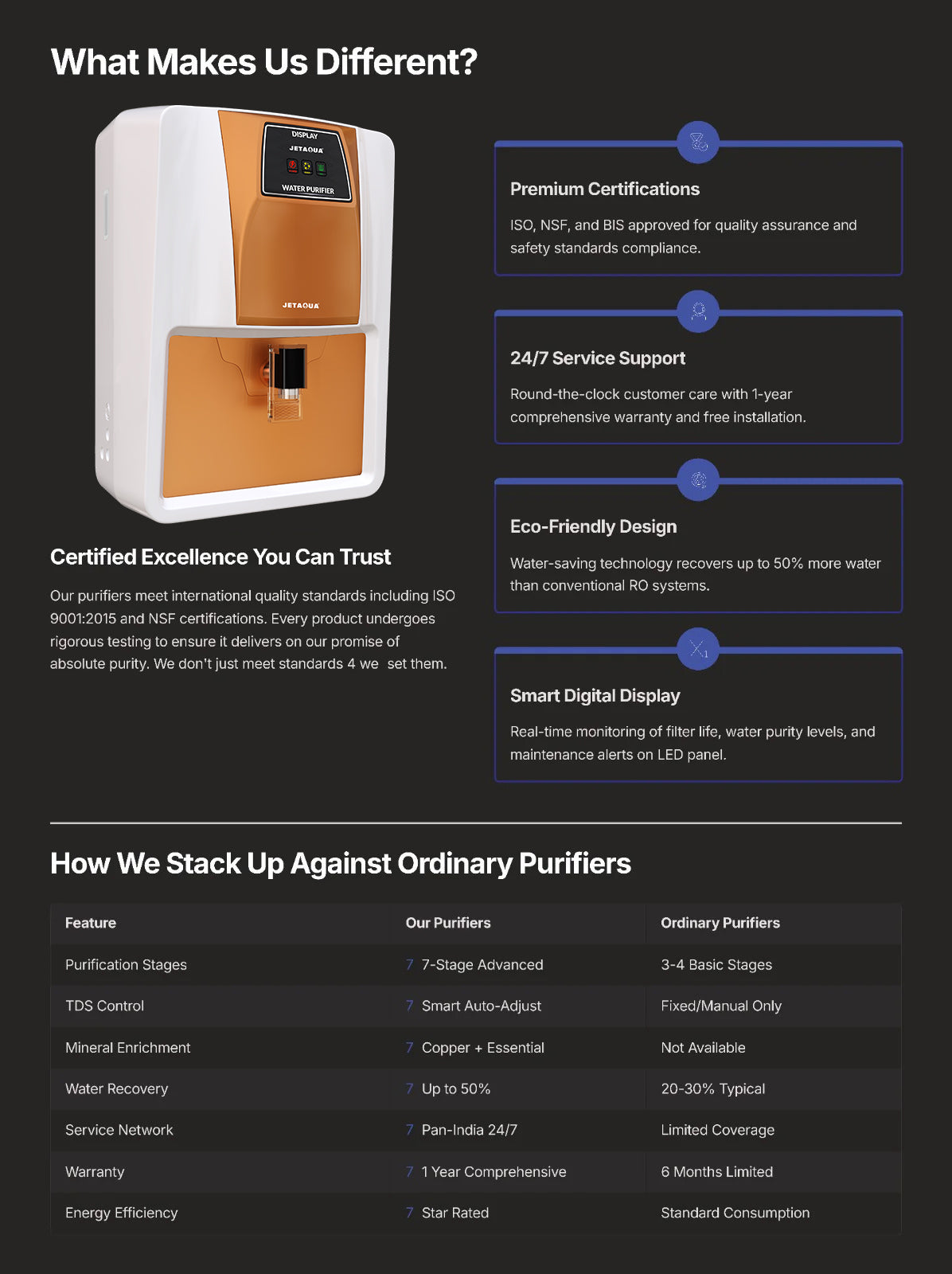 Elevate your family’s drinking water experience with the JetAqua Z-Plus Water Purifier — a powerful blend of technology, design, and health. Engineered with 7-stage purification combining RO, UV, UF, Copper, Zinc, and Alkaline filtration, this purifier ensures every drop is safe, mineral-rich, and naturally...